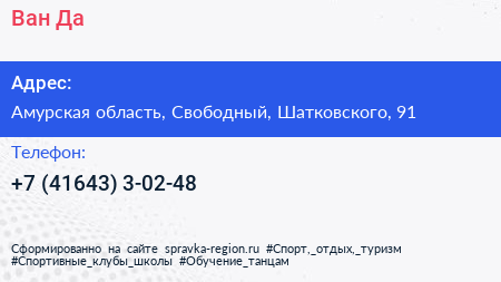 Ван Да по адресу Амурская область, Свободный, Шатковского, 91 в дальнейшем Организация, размещена в следующих категориях: