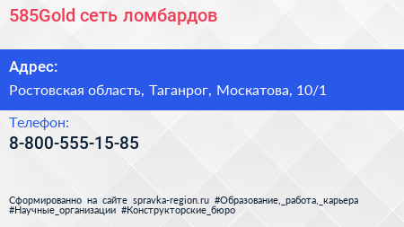 585Gold, сеть ломбардов по адресу Ростовская область, Таганрог, Москатова, 10/1 в дальнейшем Организация, размещена в следующих категориях: