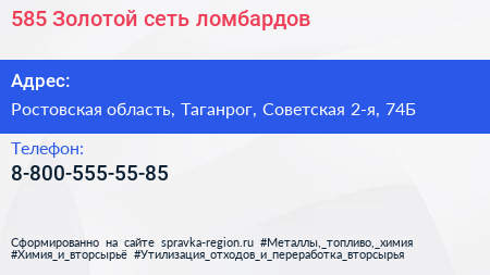 585*Золотой, сеть ломбардов по адресу Ростовская область, Таганрог, Советская 2-я, 74Б в дальнейшем Организация, размещена в следующих категориях: