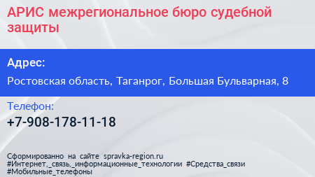 АРИС, межрегиональное бюро судебной защиты по адресу Ростовская область, Таганрог, Большая Бульварная, 8 в дальнейшем Организация, размещена в следующих категориях: