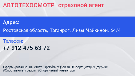 АВТОТЕХОСМОТР+, страховой агент по адресу Ростовская область, Таганрог, Лизы Чайкиной, 64/4 в дальнейшем Организация, размещена в следующих категориях: