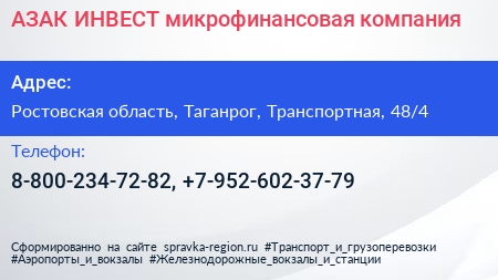 АЗАК-ИНВЕСТ, микрофинансовая компания по адресу Ростовская область, Таганрог, Транспортная, 48/4 в дальнейшем Организация, размещена в следующих категориях: