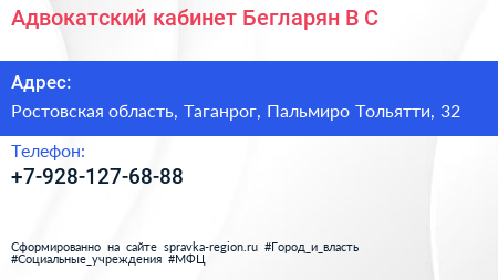 Адвокатский кабинет Бегларян В.С. по адресу Ростовская область, Таганрог, Пальмиро Тольятти, 32 в дальнейшем Организация, размещена в следующих категориях: