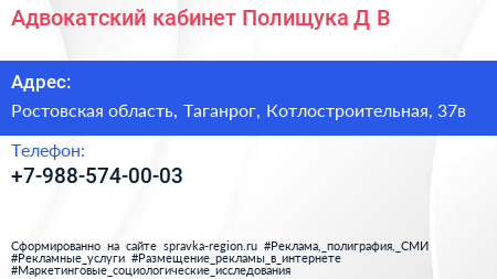 Адвокатский кабинет Полищука Д.В. по адресу Ростовская область, Таганрог, Котлостроительная, 37в в дальнейшем Организация, размещена в следующих категориях: