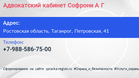 Адвокатский кабинет Софрони А.Г. по адресу Ростовская область, Таганрог, Петровская, 41 в дальнейшем Организация, размещена в следующих категориях: