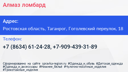 Алмаз, ломбард по адресу Ростовская область, Таганрог, Гоголевский переулок, 18 в дальнейшем Организация, размещена в следующих категориях: