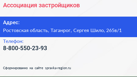 Ассоциация застройщиков по адресу Ростовская область, Таганрог, Сергея Шило, 265в/1 в дальнейшем Организация, размещена в следующих категориях: