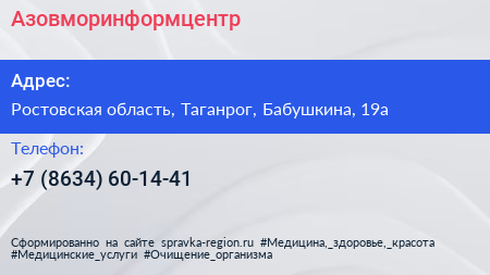 Азовморинформцентр по адресу Ростовская область, Таганрог, Бабушкина, 19а в дальнейшем Организация, размещена в следующих категориях: