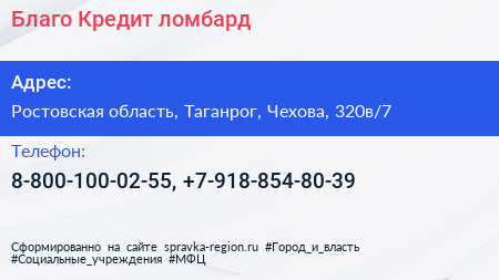 Благо Кредит, ломбард по адресу Ростовская область, Таганрог, Чехова, 320в/7 в дальнейшем Организация, размещена в следующих категориях: