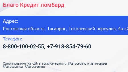 Благо Кредит, ломбард по адресу Ростовская область, Таганрог, Гоголевский переулок, 4а к2 в дальнейшем Организация, размещена в следующих категориях: