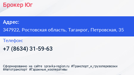 Брокер-Юг по адресу 347922, Ростовская область, Таганрог, Петровская, 35 в дальнейшем Организация, размещена в следующих категориях:
