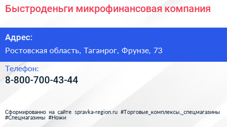 Быстроденьги, микрофинансовая компания по адресу Ростовская область, Таганрог, Фрунзе, 73 в дальнейшем Организация, размещена в следующих категориях: