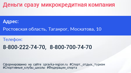 Деньги сразу, микрокредитная компания по адресу Ростовская область, Таганрог, Москатова, 10 в дальнейшем Организация, размещена в следующих категориях: