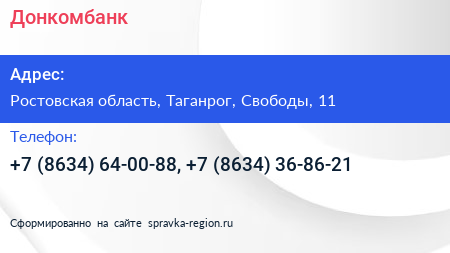 Донкомбанк по адресу Ростовская область, Таганрог, Свободы, 11 в дальнейшем Организация, размещена в следующих категориях: