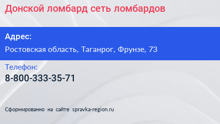 Донской ломбард, сеть ломбардов по адресу Ростовская область, Таганрог, Фрунзе, 73 в дальнейшем Организация, размещена в следующих категориях: