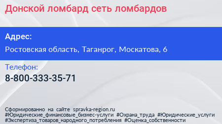 Донской ломбард, сеть ломбардов по адресу Ростовская область, Таганрог, Москатова, 6 в дальнейшем Организация, размещена в следующих категориях: