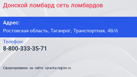 Донской ломбард, сеть ломбардов по адресу Ростовская область, Таганрог, Транспортная, 48/6 в дальнейшем Организация, размещена в следующих категориях: