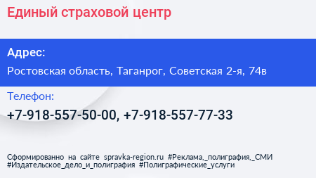 Единый страховой центр по адресу Ростовская область, Таганрог, Советская 2-я, 74в в дальнейшем Организация, размещена в следующих категориях: