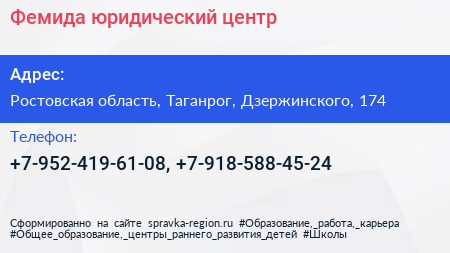Фемида, юридический центр по адресу Ростовская область, Таганрог, Дзержинского, 174 в дальнейшем Организация, размещена в следующих категориях:
