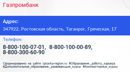 Газпромбанк по адресу 347922, Ростовская область, Таганрог, Греческая, 17 в дальнейшем Организация, размещена в следующих категориях: