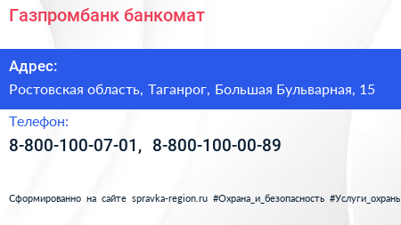 Газпромбанк, банкомат по адресу Ростовская область, Таганрог, Большая Бульварная, 15 в дальнейшем Организация, размещена в следующих категориях: