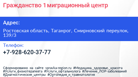 Гражданство №1, миграционный центр по адресу Ростовская область, Таганрог, Смирновский переулок, 139/3 в дальнейшем Организация, размещена в следующих категориях: