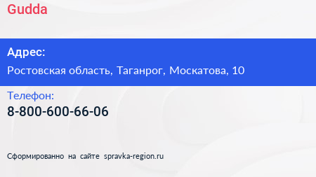 Gudda по адресу Ростовская область, Таганрог, Москатова, 10 в дальнейшем Организация, размещена в следующих категориях: