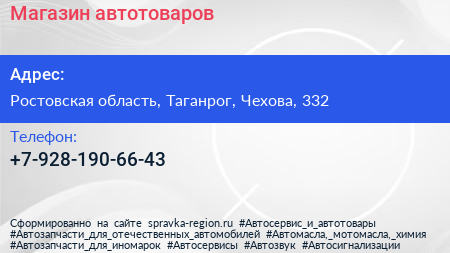 Магазин автотоваров по адресу Ростовская область, Таганрог, Чехова, 332 в дальнейшем Организация, размещена в следующих категориях:
