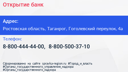 Открытие, банк по адресу Ростовская область, Таганрог, Гоголевский переулок, 4а в дальнейшем Организация, размещена в следующих категориях: