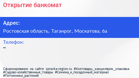 Открытие, банкомат по адресу Ростовская область, Таганрог, Москатова, 6а в дальнейшем Организация, размещена в следующих категориях: