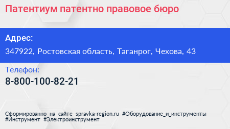 Патентиум, патентно-правовое бюро по адресу 347922, Ростовская область, Таганрог, Чехова, 43 в дальнейшем Организация, размещена в следующих категориях: