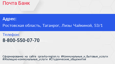 Почта Банк по адресу Ростовская область, Таганрог, Лизы Чайкиной, 53/1 в дальнейшем Организация, размещена в следующих категориях: