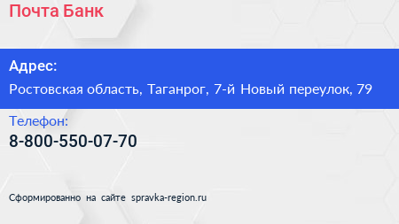 Почта Банк по адресу Ростовская область, Таганрог, 7-й Новый переулок, 79 в дальнейшем Организация, размещена в следующих категориях: