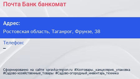 Почта Банк, банкомат по адресу Ростовская область, Таганрог, Фрунзе, 38 в дальнейшем Организация, размещена в следующих категориях: