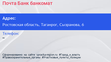 Почта Банк, банкомат по адресу Ростовская область, Таганрог, Сызранова, 6 в дальнейшем Организация, размещена в следующих категориях: