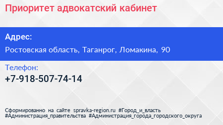 Приоритет, адвокатский кабинет по адресу Ростовская область, Таганрог, Ломакина, 90 в дальнейшем Организация, размещена в следующих категориях: