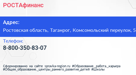 РОСТАфинанс по адресу Ростовская область, Таганрог, Комсомольский переулок, 5 в дальнейшем Организация, размещена в следующих категориях: