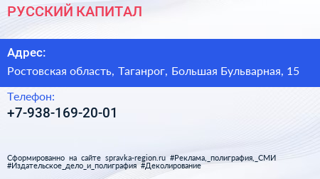 РУССКИЙ КАПИТАЛ по адресу Ростовская область, Таганрог, Большая Бульварная, 15 в дальнейшем Организация, размещена в следующих категориях: