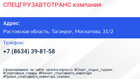СПЕЦГРУЗАВТОТРАНС, компания по адресу Ростовская область, Таганрог, Москатова, 31/2 в дальнейшем Организация, размещена в следующих категориях: