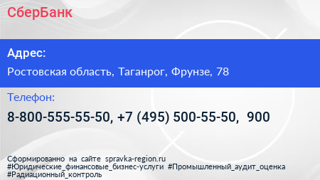 СберБанк по адресу Ростовская область, Таганрог, Фрунзе, 78 в дальнейшем Организация, размещена в следующих категориях: