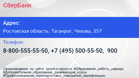 СберБанк по адресу Ростовская область, Таганрог, Чехова, 357 в дальнейшем Организация, размещена в следующих категориях: