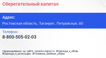 Сберегательный капитал по адресу Ростовская область, Таганрог, Петровская, 60 в дальнейшем Организация, размещена в следующих категориях:
