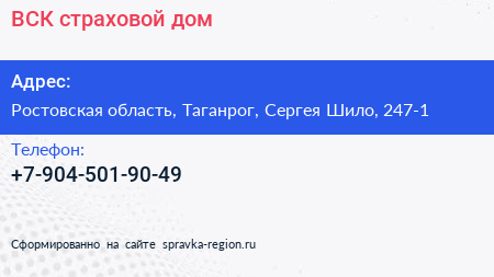 ВСК, страховой дом по адресу Ростовская область, Таганрог, Сергея Шило, 247-1 в дальнейшем Организация, размещена в следующих категориях: