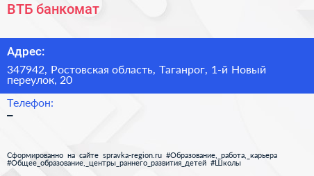 ВТБ, банкомат по адресу 347942, Ростовская область, Таганрог, 1-й Новый переулок, 20 в дальнейшем Организация, размещена в следующих категориях: