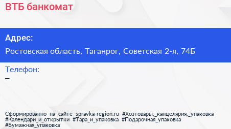 ВТБ, банкомат по адресу Ростовская область, Таганрог, Советская 2-я, 74Б в дальнейшем Организация, размещена в следующих категориях: