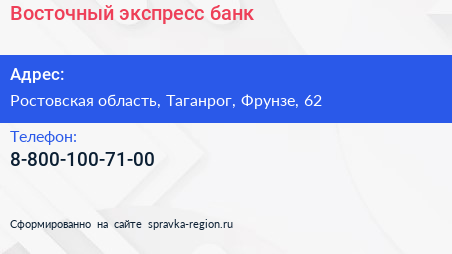 Восточный экспресс банк по адресу Ростовская область, Таганрог, Фрунзе, 62 в дальнейшем Организация, размещена в следующих категориях: