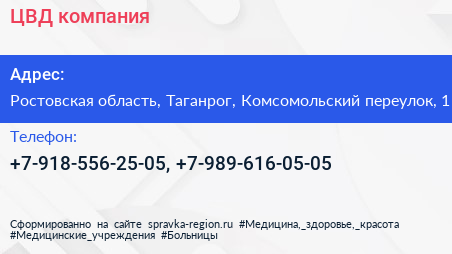 ЦВД, компания по адресу Ростовская область, Таганрог, Комсомольский переулок, 1 в дальнейшем Организация, размещена в следующих категориях: