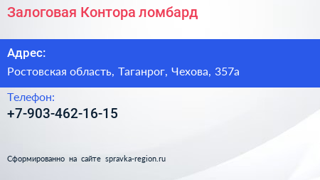 Залоговая Контора, ломбард по адресу Ростовская область, Таганрог, Чехова, 357а в дальнейшем Организация, размещена в следующих категориях:
