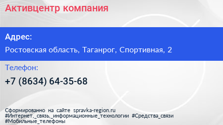Активцентр, компания по адресу Ростовская область, Таганрог, Спортивная, 2 в дальнейшем Организация, размещена в следующих категориях: