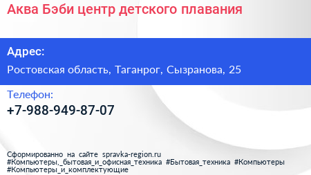 Аква Бэби, центр детского плавания по адресу Ростовская область, Таганрог, Сызранова, 25 в дальнейшем Организация, размещена в следующих категориях: